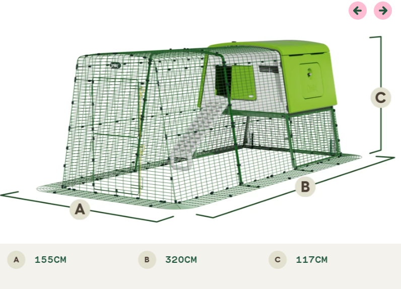Here are the official internal and external dimensions of the Eglu Cube (either MK1 or MK2), including the varying sizes of runs: