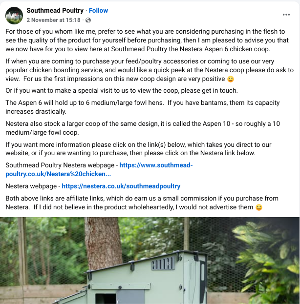 Soutmead Poultry is an independent outfit that offers chicken boarding amongst other services. They are currently using a Nestera coop to house a small flock of hens on-site.